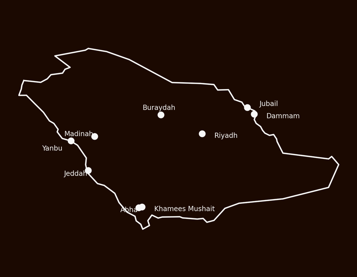 Buraydah | Abha | Khamees Mushait | Makkah | Tabuk | Al Jawf | Madinah | Yanbu | Jeddah | Riyadh | Dammam | Jubail